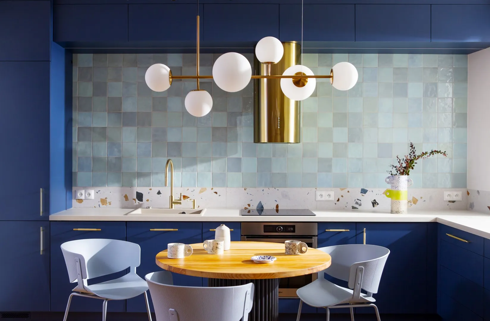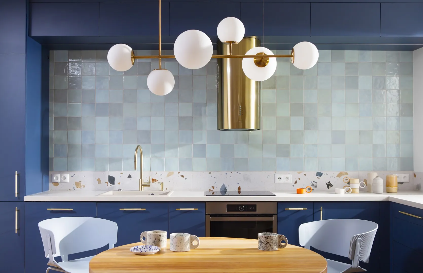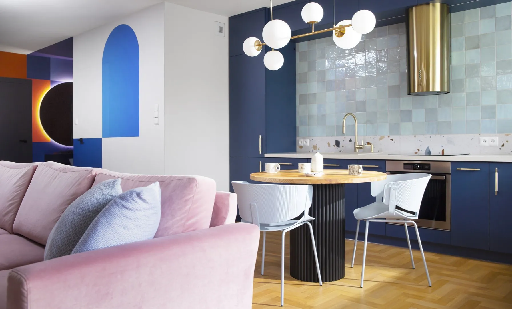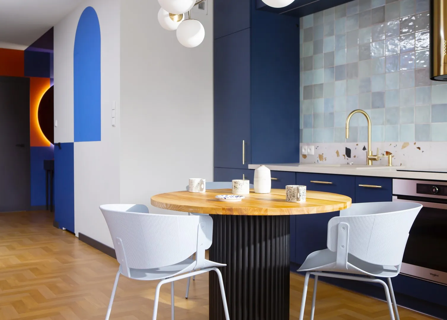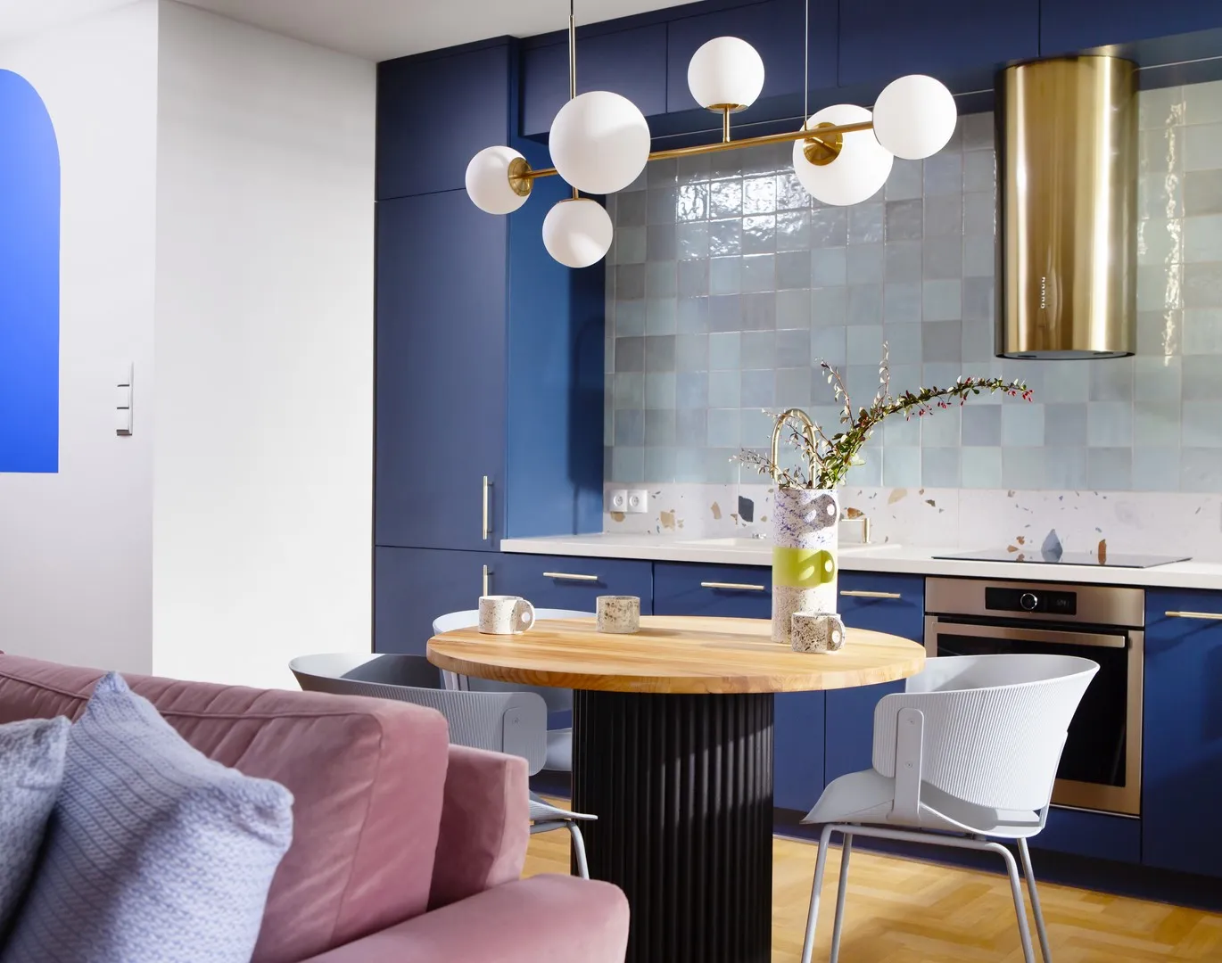Kuchnia w projekcie „Tu rządzi kolor” zachwyca granatowymi szafkami, które kontrastują z jasnymi płytkami na ścianach i blatem z terazzo w stylu lastryko. Złota armatura i designerska lampa nad stołem dodają wnętrzu luksusu, a drewniana podłoga w jodełkę wprowadza ciepły, naturalny akcent. Otwarta przestrzeń kuchni płynnie łączy się z częścią dzienną, tworząc spójną całość. Nowoczesna aranżacja wnętrz z odważnymi barwami w kuchni sprawia, że gotowanie staje się przyjemnością, a przestrzeń zachęca do spędzania czasu.