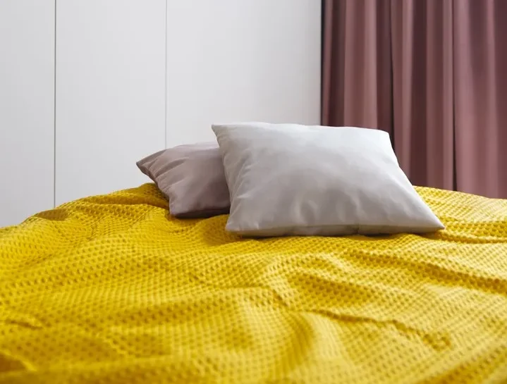 Klasyczna w wystroju sypialnia to śnieżnobiała przestrzeń, której charakteru dodają brudnoróżowe pluszowe zasłony i identyczny kolor zagłówka, złamane intensywną żółcią poduszek i narzuty na łóżko.