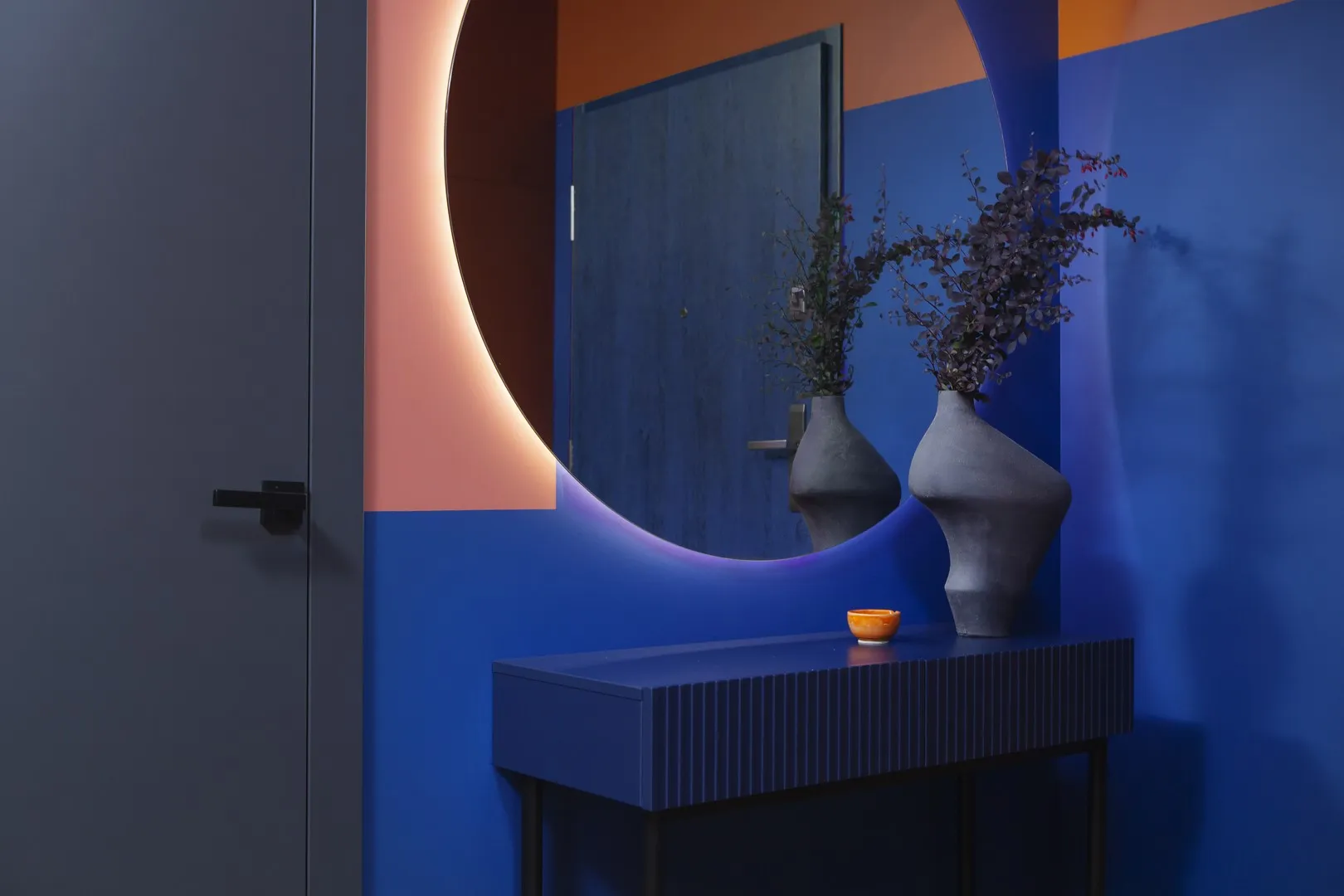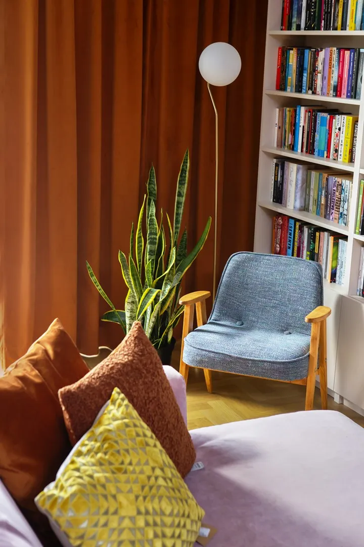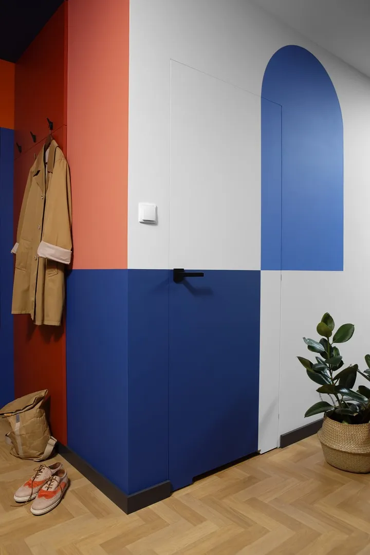 Przy tej realizacji – dzięki odwadze i otwartości inwestorów – mogliśmy poszaleć i …. być konsekwentni jednocześnie. Geometryczny, ciemny, pomarańczowo-niebiesko-granatowy i szeroki przedpokój jest śluzą do pozostałych pomieszczeń, w których króluje miedź i granat. Jedna z kolorowych ścian kryje zatopione w niej drzwi prowadzące do pomieszczenia gospodarczego. Wykończona morskimi płytkami i marmurowym spiekiem ściana w aneksie kuchennym kontrastuje z ciemnogranatowymi szafkami i złotym okapem. W części salonu króluje pastelowa, brudnoróżowa kanapa i nietypowy, oparty na wspornikach miedziany regał na książki i płyty. Rudo-miedziane zasłony i kwiaty w doniczkach dodają przestrzeni przytulności.