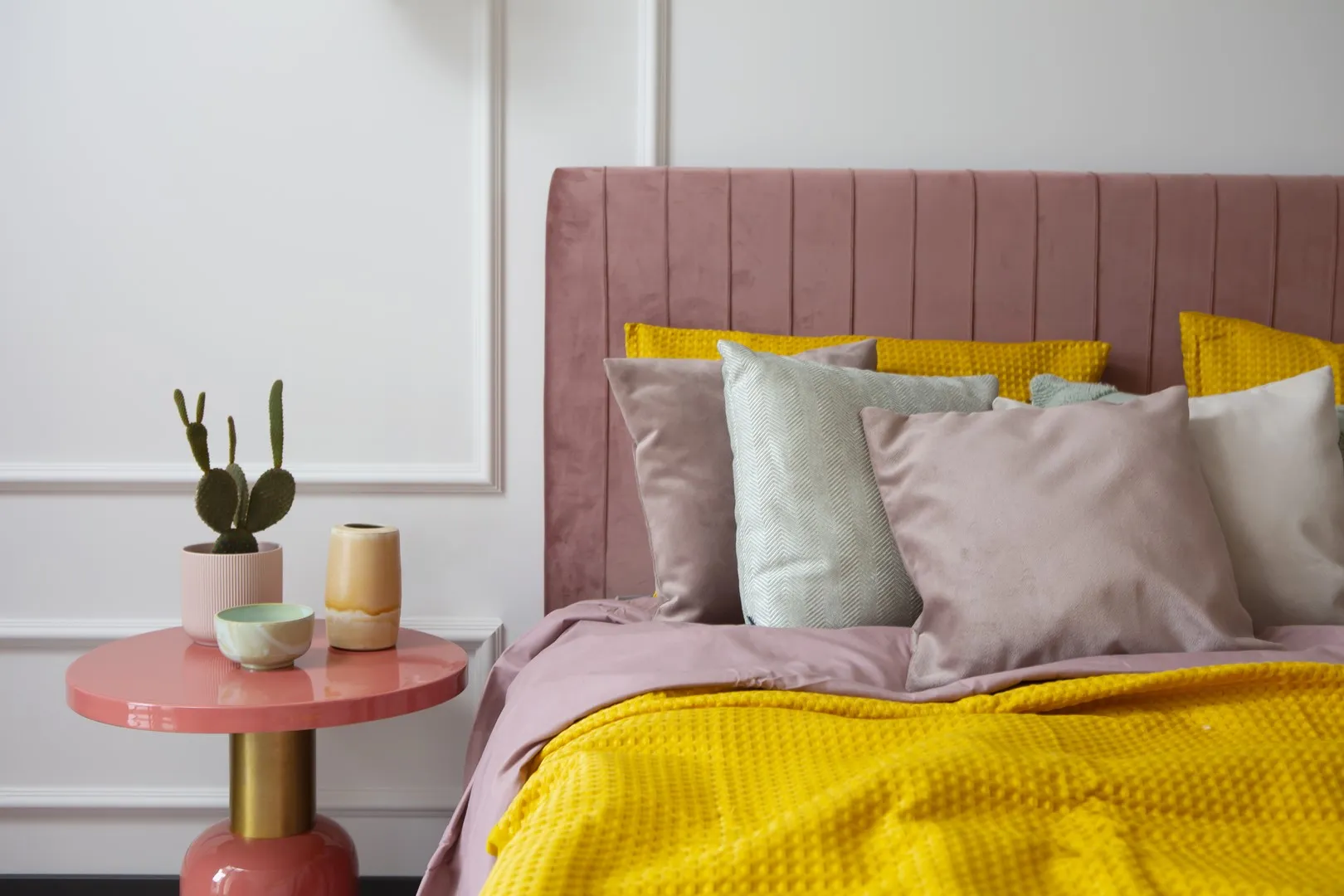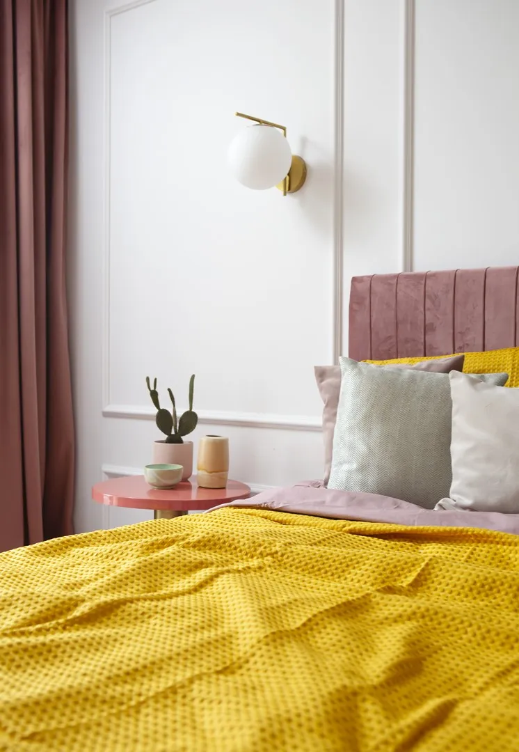Sypialnia w tej realizacji to oaza spokoju z nutą energii. Różowy zagłówek łóżka w połączeniu z żółtą narzutą i poduszkami w odcieniach szarości i różu tworzy przytulny, ale dynamiczny klimat. Różowe zasłony i okrągły stolik w tym samym kolorze dodają wnętrzu spójności, a rośliny doniczkowe, takie jak kaktus na stoliku, wnoszą naturalny akcent. Subtelne oświetlenie, w tym kinkiety w złotym wykończeniu, podkreśla ciepłą atmosferę, czyniąc sypialnię idealnym miejscem do odpoczynku.