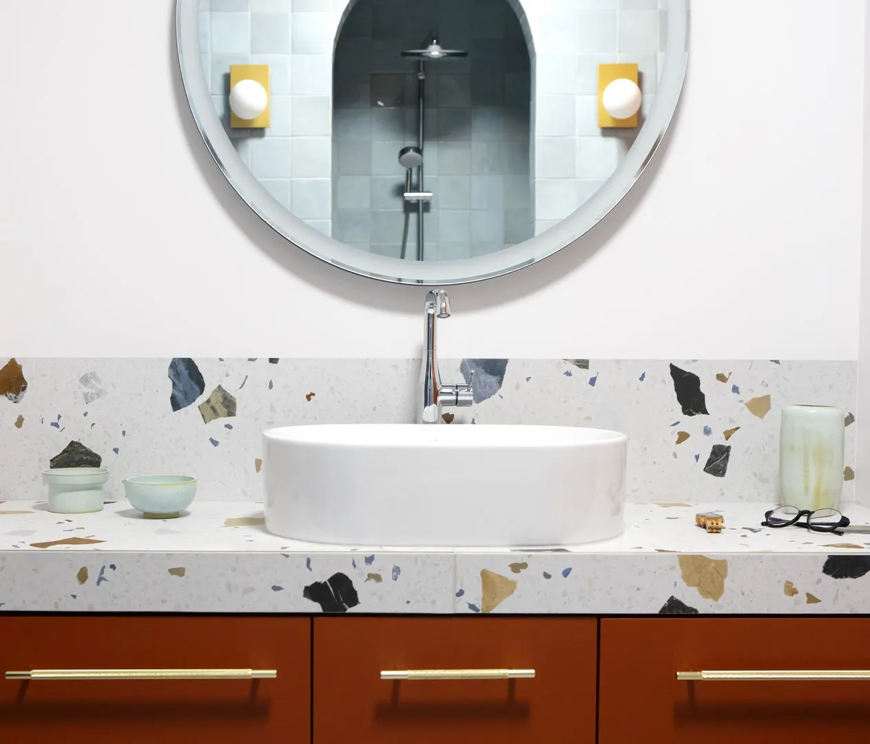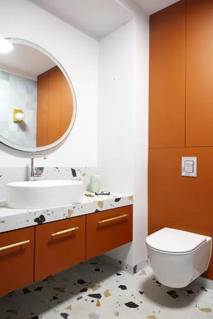 Łazienka w projekcie „Tu rządzi kolor” to połączenie nowoczesności i elegancji. Blat z terazzo w stylu lastryko, z widocznymi kolorowymi drobinkami, kontrastuje z granatowymi ścianami i jasnymi płytkami w kabinie prysznicowej. Złote detale, takie jak armatura i kinkiety, dodają wnętrzu luksusu, a okrągłe lustro optycznie powiększa przestrzeń. Łazienka jest nie tylko piękna, ale i funkcjonalna, co czyni ją idealnym dopełnieniem tego kolorowego apartamentu.